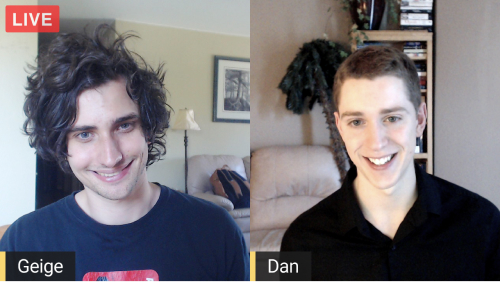 Happily, it took all of about 15 minutes before we stumbled onto a website called StreamYard, which has a broadcast platform that was developed by two millennials who look like they graduated high school one night, rolled out of bed the next morning, and threw something together before heading to Taco Bell for a 4 pm chalupa. Here they are (I won’t even try to pronounce “Geige” but I will steal his hair. Heck, I’ll steal anyone’s hair):